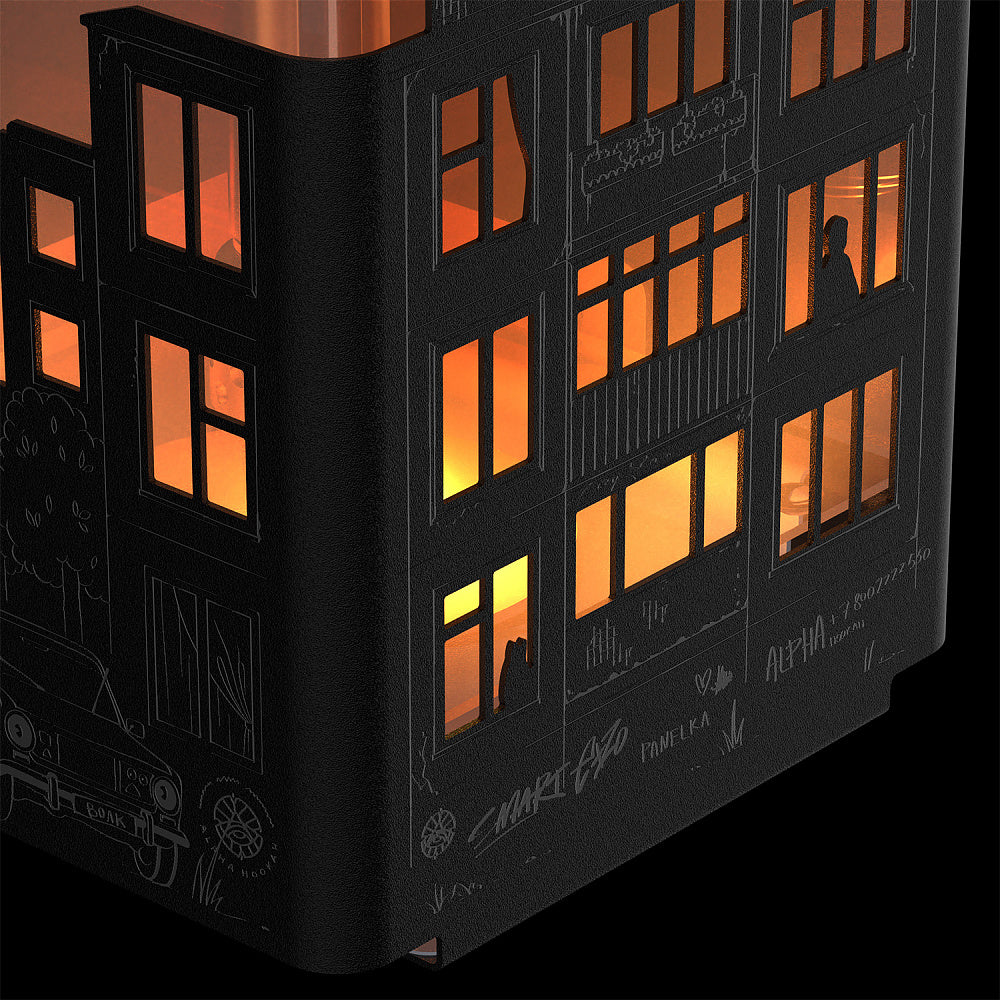 旧ソ連圏の象徴的な建築スタイルを再現した取り外し可能なハウジング。精密に切り抜かれた「窓」の一つひとつは、過去への入り口です。LEDライトを点灯させれば、まるで夜の街に明かりが灯るように、あなたの部屋に温かく「ランプのような」情緒をもたらします。